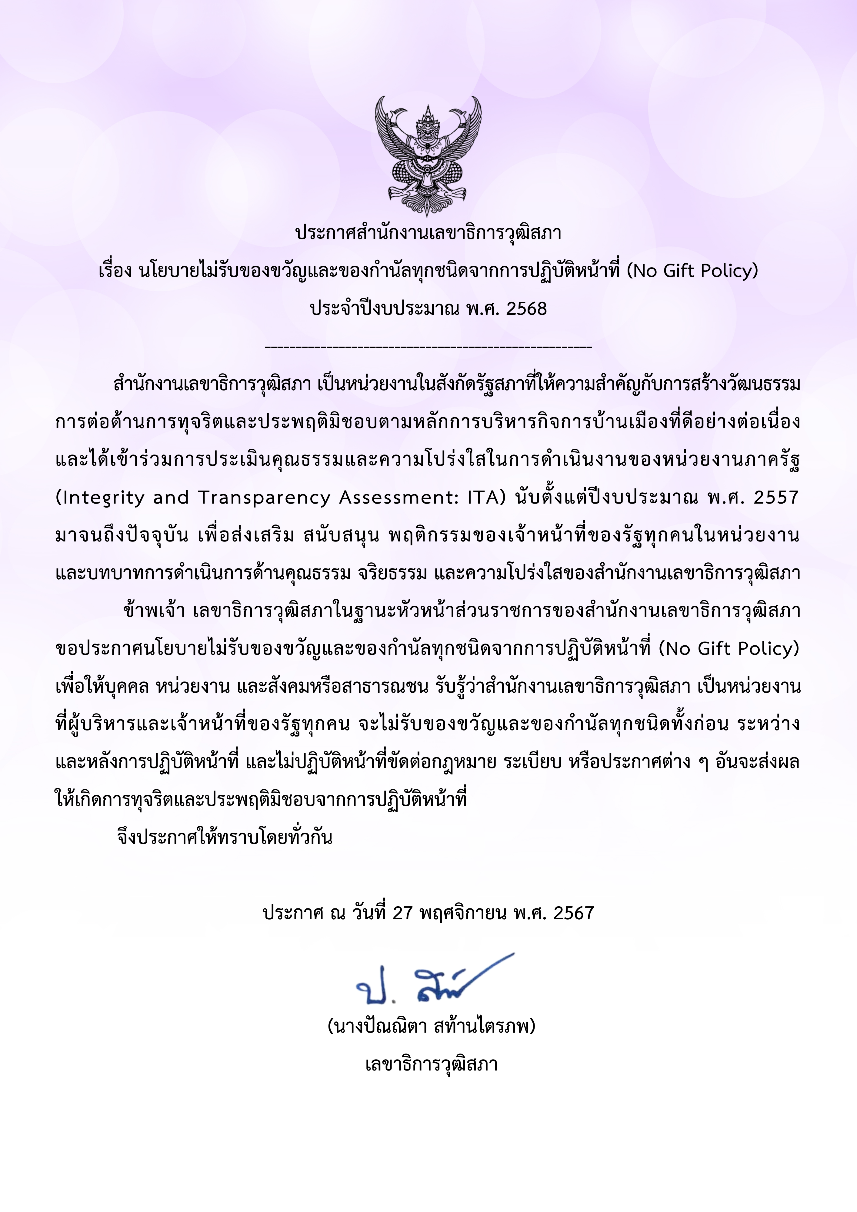 วิดิโอประชาสัมพันธ์ No Gift Policy